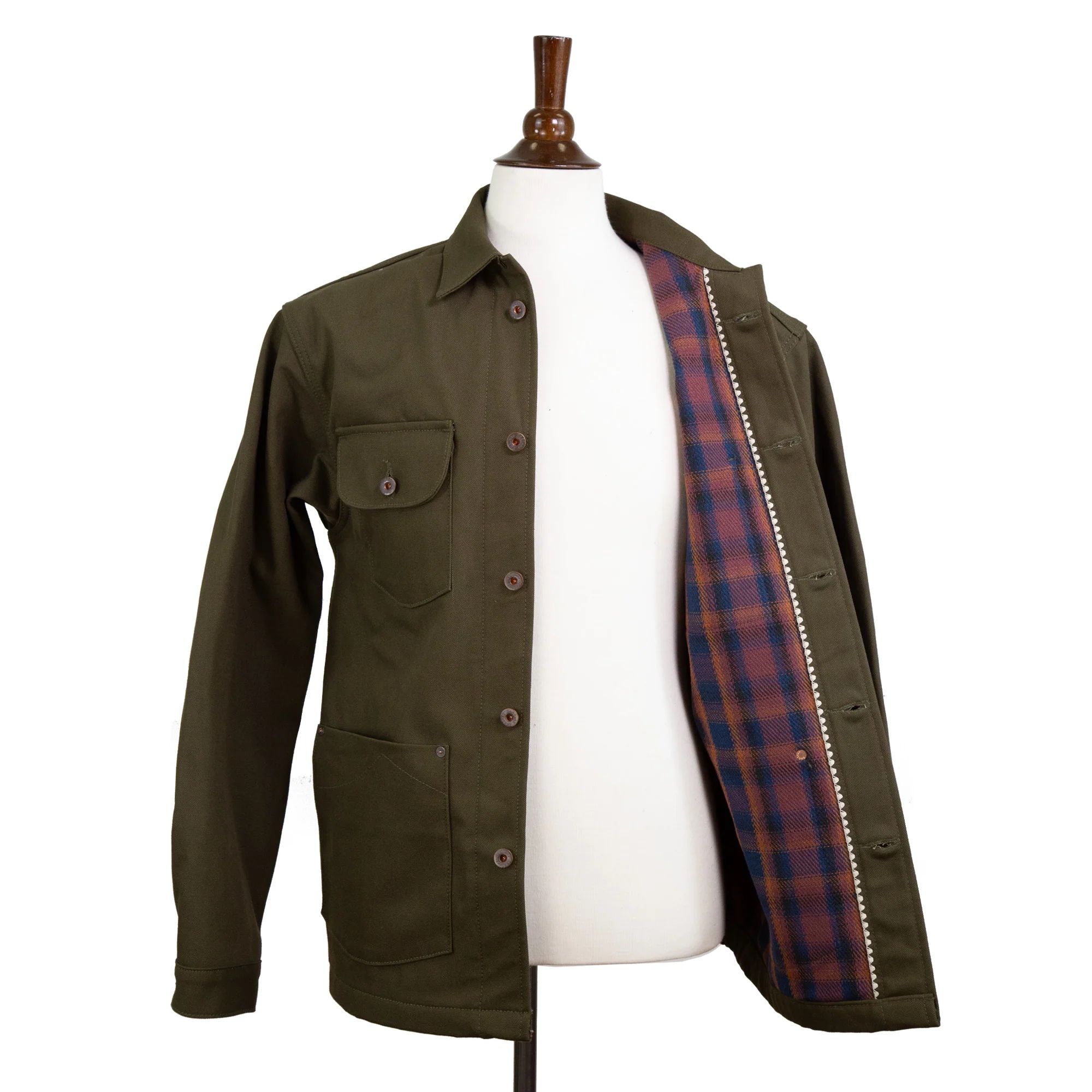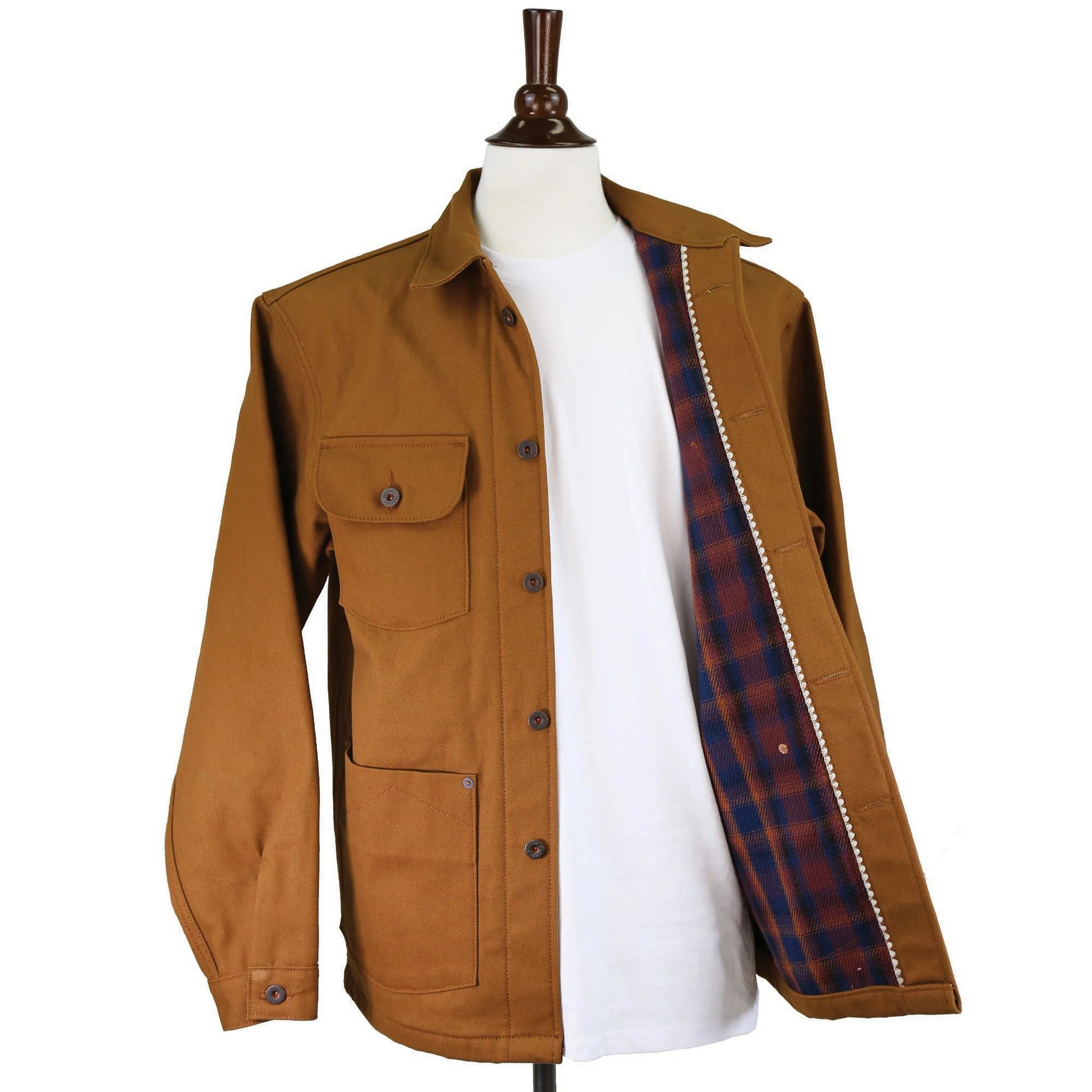 Same Baja blanket lining and California workshop build as the seaweed coat above, but this one is cut from 12oz duck canvas, a dense plain-weave cotton with a smooth face and a reputation for going the distance. Duck is one of the oldest and most proven work fabrics in American clothing, and Railcar keeps the construction tight with flat felled seams and branded hardware throughout. Interior shell edge stitching and clean, minimal labels finish the coat off. Both options are made when ordered, so plan ahead.