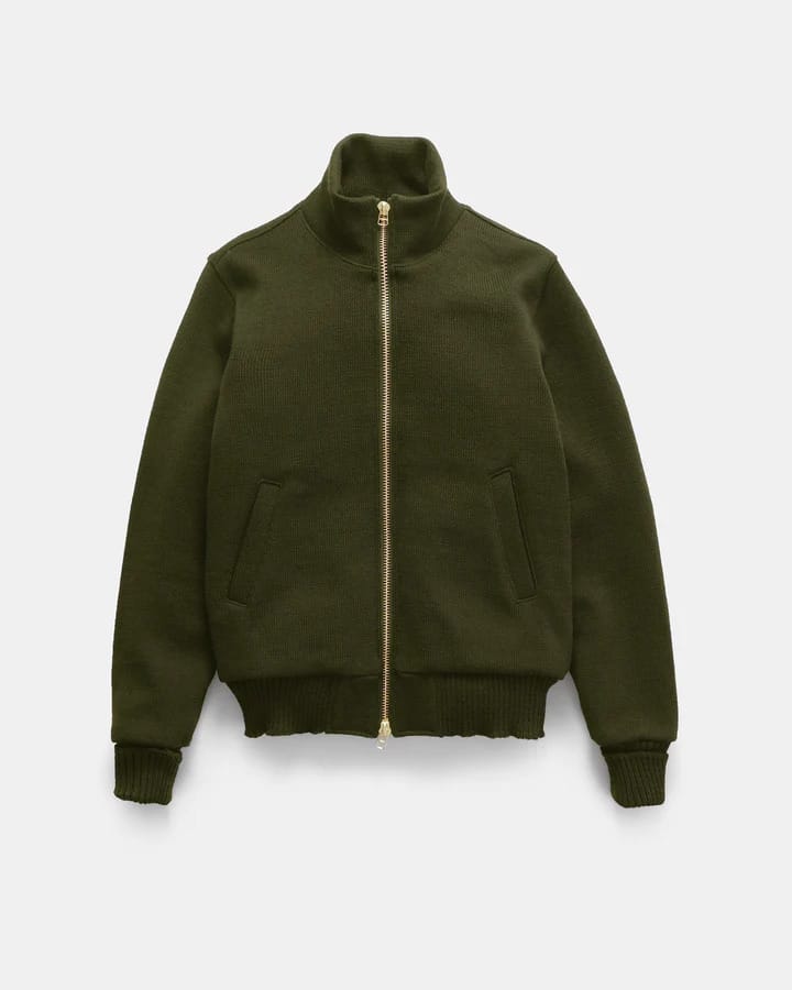 Dehen built this wool sweater on the same 1940s machines that made the original, knitting pure worsted wool into a thick jersey that holds heat. The full-zip model has a turtle collar, satin lining in the body and sleeves, and a heavy brass zipper that opens from both ends. Extra fabric patches at the elbows keep wear spots strong, and two front pockets with satin lining hold small items. Made in Portland with a solid, lasting build.