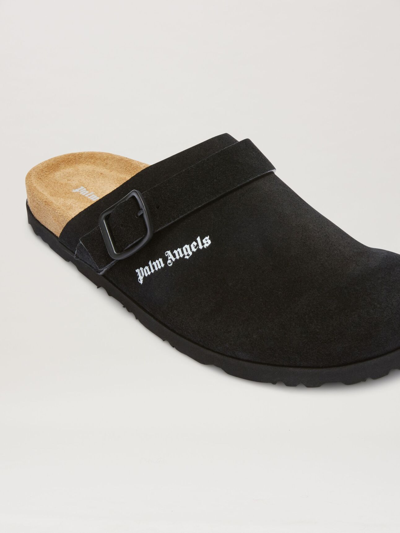 Palm Angels drops a fresh take on a Birkenstock-style clog with their logo calf leather mules. These slip-ons feature a bold white logo on the upper, adding a touch of branding to the classic Birk silhouette. The black leather construction offers both style and comfort, perfect for those who want a stylish slip on. Whether paired with jeans or shorts, these mules are head-turning among those initiated in skate.