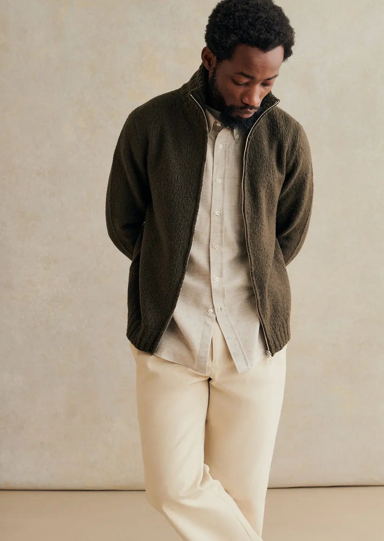 De Bonne Facture's new zipped rollneck cardigan is a cozy addition to your transitional lineup. Crafted from soft bouclé wool in a green khaki hue, this piece offers warmth without bulk. The full-length zipper and high collar provide extra defense against chilly winds. Knitted in France, it's a smart choice for those who value quality and utility in their knitwear.