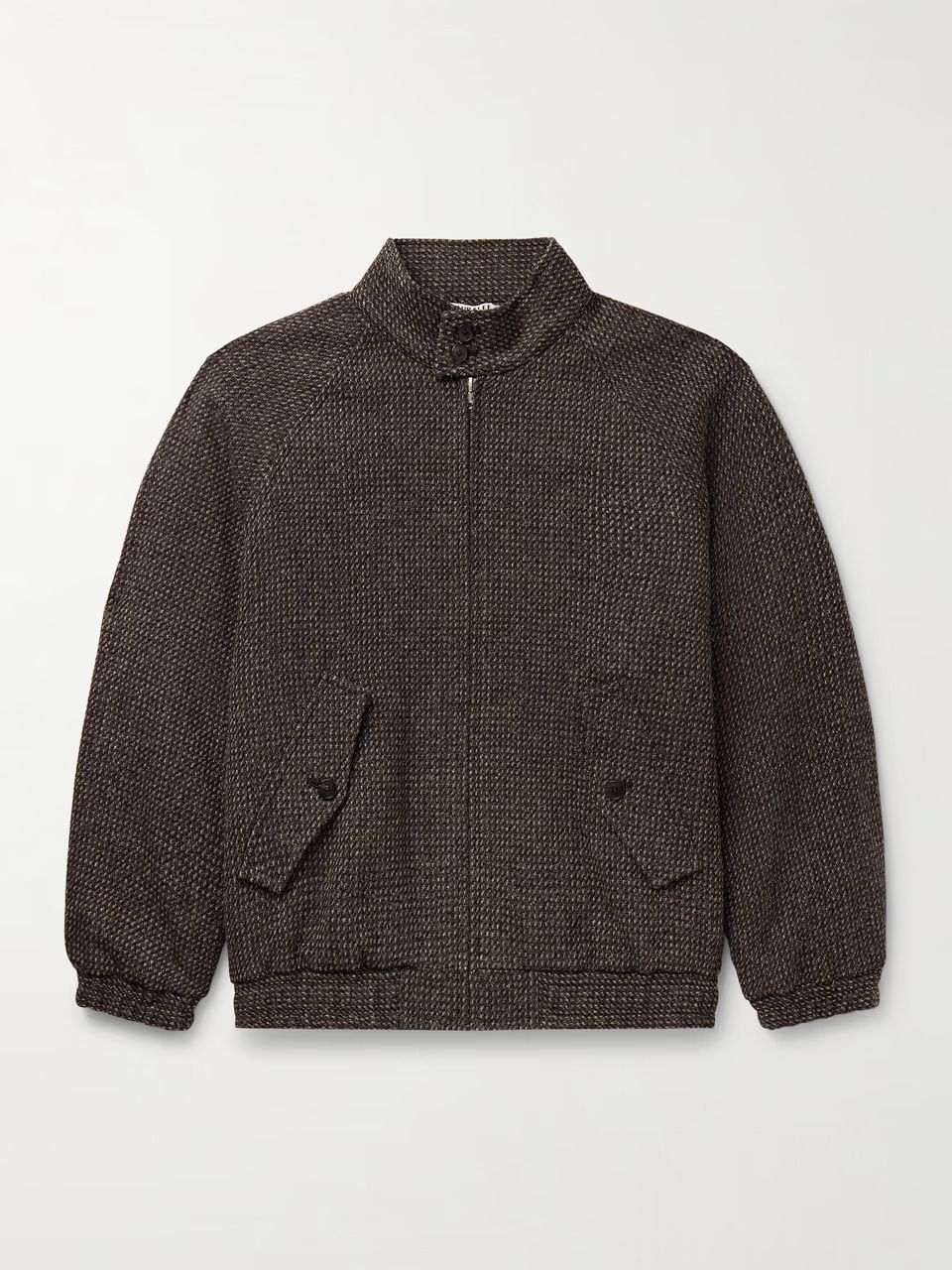 Auralee's wool, alpaca, and silk blend tweed bomber jacket has a clean, sharp cut that lifts the casual bomber style. The mix of wool and alpaca with silk gives it a soft feel and a muted sheen that sets it apart from regular tweeds. It’s lined with a breathable yet sturdy fabric to keep us comfortable all day. This jacket works well layered over knits or light shirts, making it great for fall and cooler spring days.